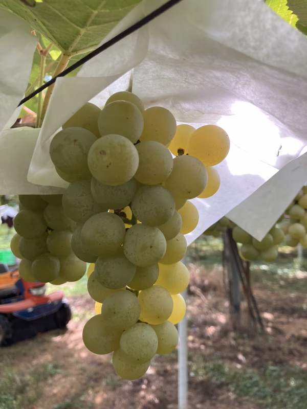 ナイヤガラ。特徴的な香りを持つぶどうで、ワインにも使われる品種です。種を出すと酸味が強まるので、噛まずにそのまま飲み込むのをお勧めします。