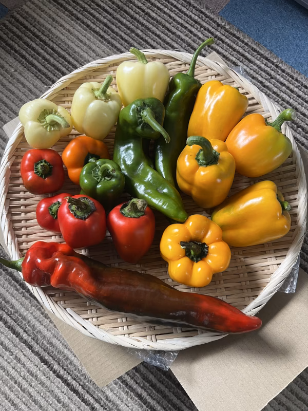 スイートピーマン,パレルモや,イタリア料理御用達のマルコーニレッド,オレンジ,白いパプリカパプリホワイト、ジャンボピーマン、グリーンパレルモ(赤く熟す前のパレルモ)など、一般的な赤パプリカ,黄色パプリカ、フルーツパプリなど,いろんなパプリカ,ピーマン品種たち,どれも新鮮でジューシー,肉厚で甘みが強い品種が多いです。