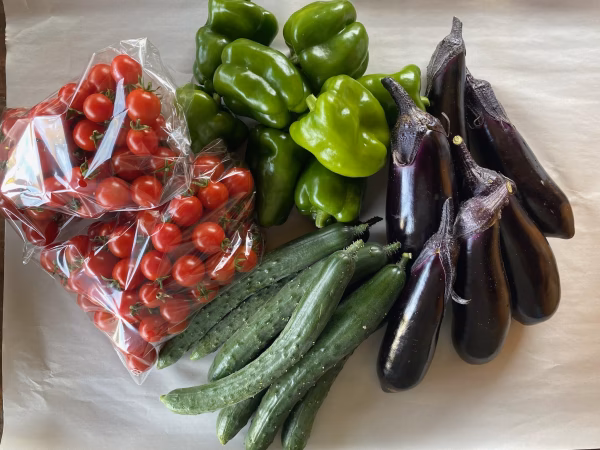 ミニトマト 1kg、ナス 約600g、きゅうり 約600g、ピーマン 約500gになります。
