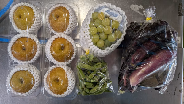 梨1.5㎏、ブドウ400g、オクラ250g、ナス1㎏の詰め合わせです。 梨は豊水で小サイズです。ブドウはシャインマスカットでB級品です。 野菜は直売品で不揃いのB級品です。 なお、複数出品のためそれぞれの重量や形状には差異がございますのでご了承ください。