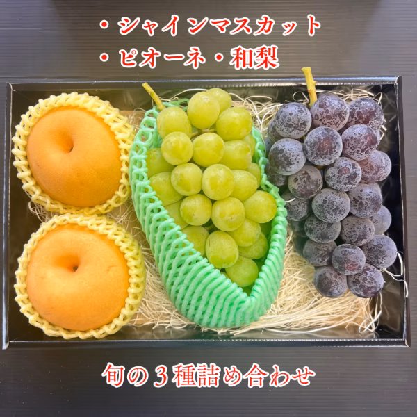 爽やかな甘さとパリッとした食感が魅力のシャインマスカット、濃厚でコクのある甘みが詰まったピオーネ、みずみずしく上品な甘さの梨をセットにしました。
