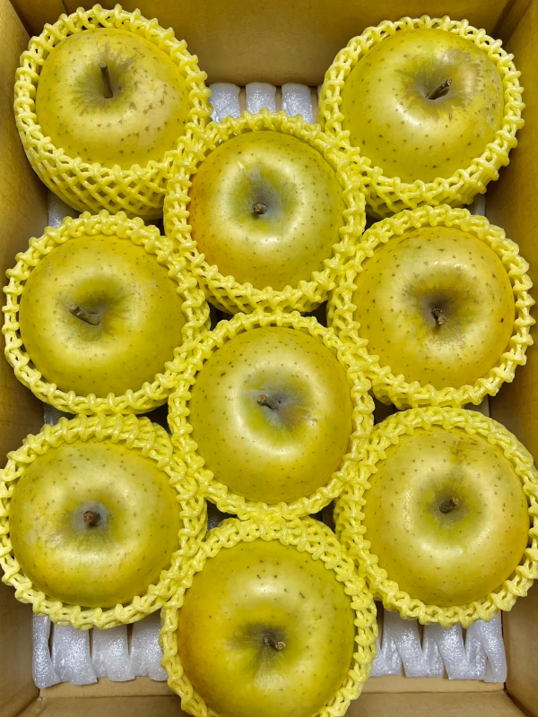 サクサクしていて、とてもジューシーで、甘味の中にしっかりとした酸味を感じることができる、さわやかな風味の黄色いりんごです。樹上で完熟したりんごをお届けします。