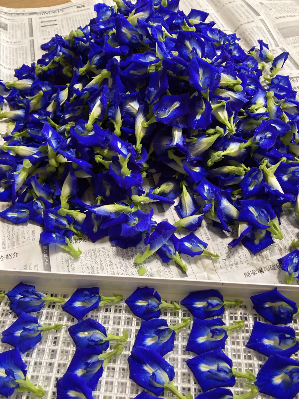 農薬、化学肥料をいっさい使わずに育てたバタフライピー(チョウマメ)ティー。乾燥させた花だけをパッキングしています。