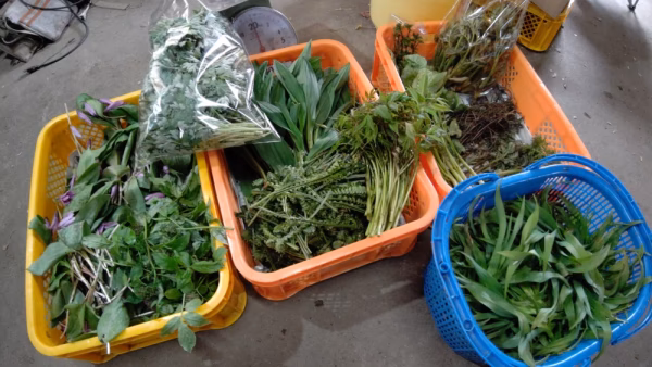 かたくり、たらの芽、こごめ、ニワトコ、あけびの新芽、行者にんにく、ミツバ、じょんななどに和え物用に割った胡桃も入れて、内容はこちらのお任せでご用意致します。