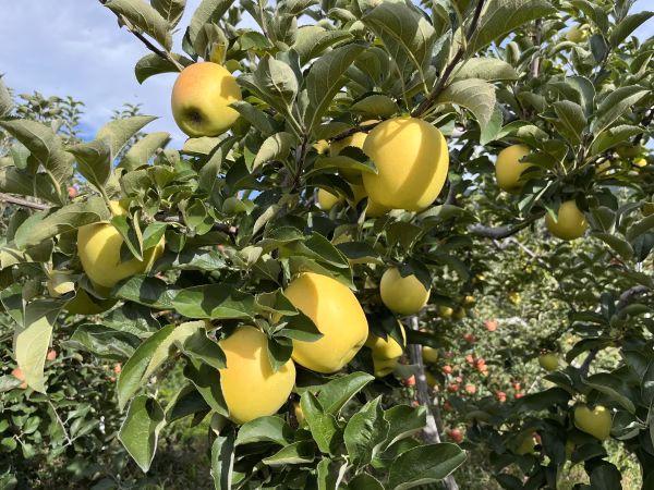 サクサクしていて、とてもジューシーで、甘味の中にしっかりとした酸味を感じることができる、さわやかな風味の黄色いりんごです。樹上で完熟したりんごをお届けします。