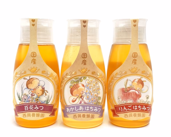 大事に丁寧に採った自慢の百花蜂蜜と、青森までミツバチたちを連れていき、採ったりんご蜂蜜と、白いあかしあの花から採ったあかしあ蜂蜜の3本セットです!