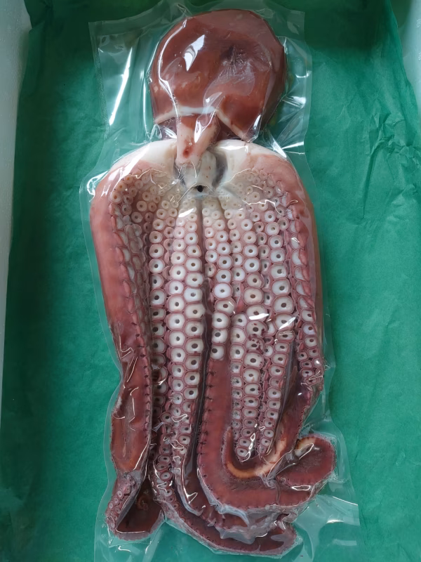 タコ箱漁で水揚げされたタコを即浜茹でし、真空パックをして急速冷凍しています。