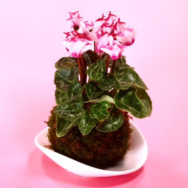 蝶々のように可憐なお花シクラメンと高野山麓で採取しまし這苔を使った苔玉です。