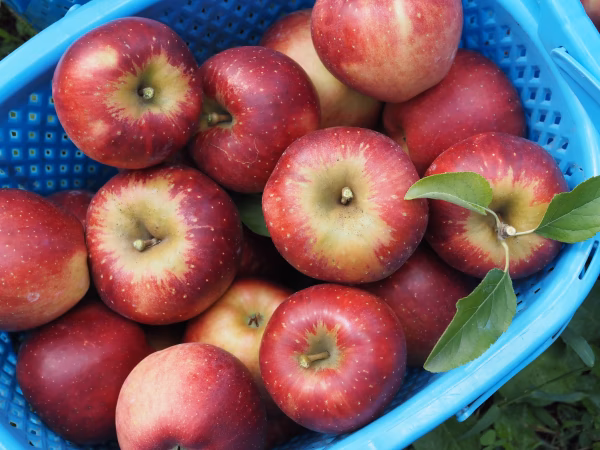 ●赤いりんごは収穫前に「葉摘み」という作業を行います。赤いりんごをよく日光に当て、果皮を赤く色づけるためです。当園は秋映えはあまりしっかり葉っぱを取らないので、かなり最低限にしております。そのため、果皮の着色がやや薄いりんごがある場合がございますが、食味優先でお届けいたします!