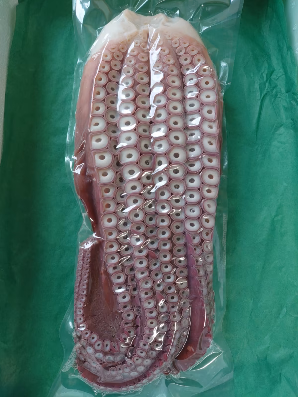 タコ箱漁で水揚げされたタコを即浜茹でし、真空パックをして急速冷凍しています。