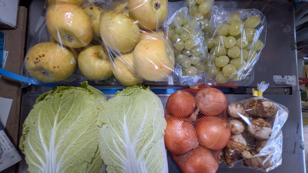 リンゴ2.5kg、ブドウ1kg、ハクサイ2kg、サトイモ700g、タマネギ1kgの詰め合わせです。