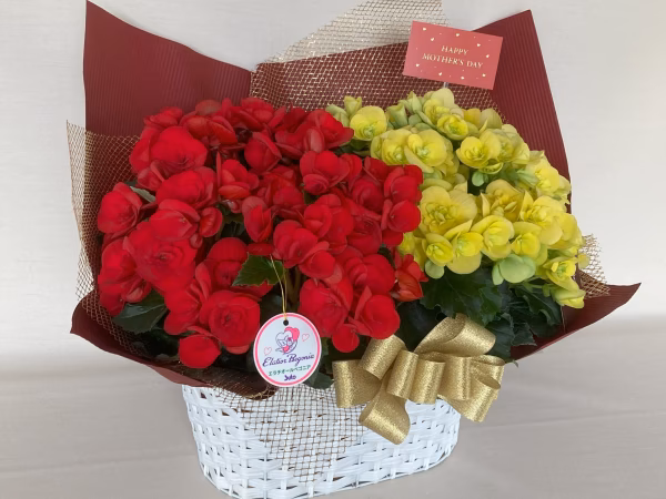 エラチオールベゴニアの魅力を詰め込んだ、一鉢でも十分豪華な5寸鉢の2鉢入りバスケットです。特別な逸品です。
