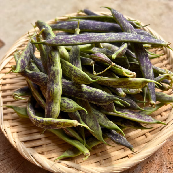 愛知県豊田市の中山間地域・旭地区で育った黒い縞模様が特徴の「霜降りいんげん」です。