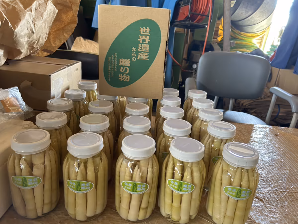 世界最古級の土器 大平山元遺跡付近から収穫した"根曲がり竹"を、そのまま瓶詰めにしました。