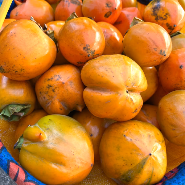 こちらは枯露柿・ころ柿・あんぽ柿など干し柿の原料となる渋柿の種類で甲州百目柿といいます。甲州百目柿は大玉も多く、肉厚でねっとりとした食感と豊かな果汁で甘味も強く仕上がることで評判の品種です。