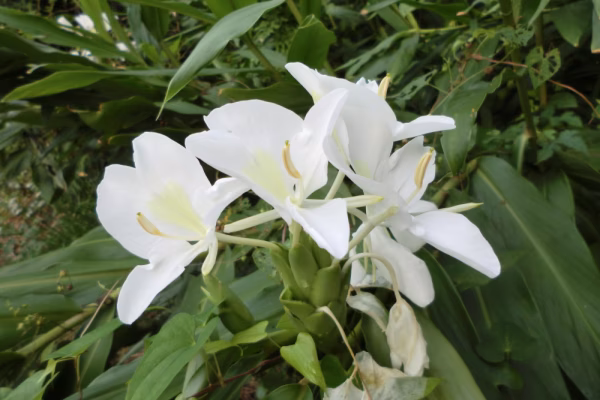 草丈が100センチを超え、大きな葉と白い花が南国を思わせる姿で葉も香り豊かです。