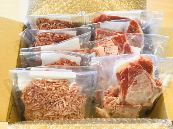 冷凍状態でお送りします。ボールなどに水をためて袋ごと入れて解凍するのが、ドリップが出にくく早く解凍できます。