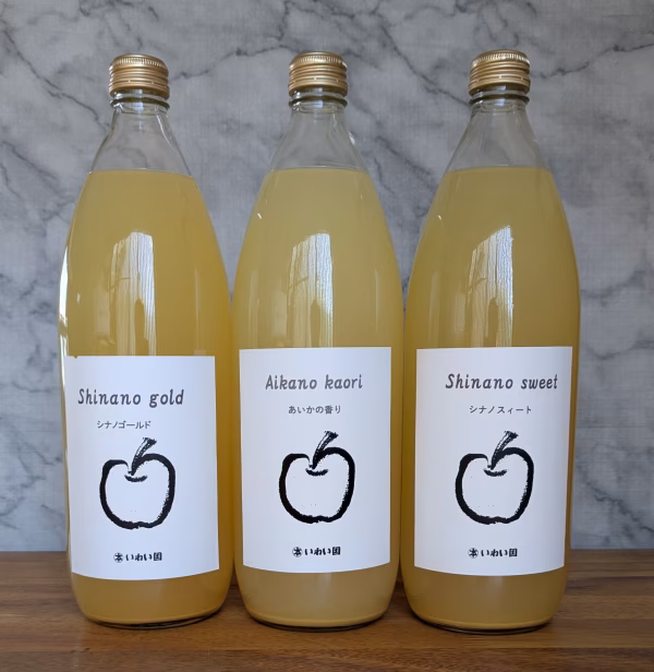 今回の詰合せりんごジュースは、あいかの香り・シナノスイート・シナノゴールド各1本づつの果汁100%となります。
