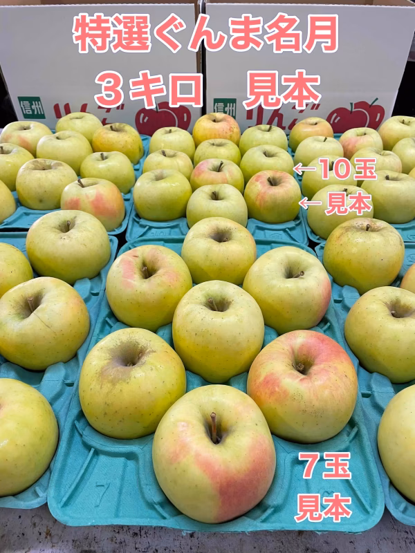 特選ぐんま名月 (贈答用) 3キロから 長野県産 産地直送 減農薬 化学肥料不使用 (沖縄県へ発送の方は、『沖縄県へ』の商品をご購入ください) 〇発送時期 ~12月上旬 3営業日以内に発送。 商品がなくなり次第終了となりますので、できるだけお早めにご注文ください。 〇商品説明 美味しいりんごの季節がやってきました! ぐんま名月は、「あかぎ」に「ふじ」を交配して作られました。 酸味が少なく、とても甘く、ジューシーな味わいで、蜜がのった品種です。 希少価値の高いりんごです。※蜜入り保証など行っていません。 お世話になっている方への贈り物・自分へのご褒美にいかがでしょうか。 贈答用として全てりんご用パック(緩衝材梱包)に入れてお送りします。 当園は、3代続く りんご・ぶどう農家です! 長野県の標高の高い畑で、車もあまり通らない空気な綺麗な場所で果物づくりをしています。 減農薬・化学肥料不使用など、安心・安全の果物を皆様にお届けします。 〇内容量 おおよその重さです。 ・特選3キロ(6~11玉) ・特選5キロ(11~18玉) ・特選10キロ(22~36玉) ・特選15キロ(48~54玉)15キロは量が多いので、早めに召し上がれる方・おすそ分けする方にオススメです。 ※『なまもの』ですので、お早めにお召し上がりください。 ・特選3キロM(12玉) ・特選5キロM(20玉) 〇注意事項 ・運送中にりんごが傷んでいた・割れていた・商品が違う場合は、至急ご連絡ください。(受取から24時間以内)商品はそのままに、当園からの返事をお待ちください。 ・時間指定のみ受け付けています。希望がある方は、申し送り事項に到着指定時間を記載ください。 ・当園は全て宅急便にて発送致します。 ・購入者様とお届け先が違う場合は、ご注文の際にご注意ください。 ※沖縄県のみ別途追加送料がかかります。『沖縄県へ発送』の商品をご購入ください。 #章わんぱく農園 #りんご #サンふじ #めいげつ #シナノゴールド #贈答用