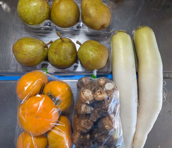 カキ1.2㎏、洋ナシ1.7kg、ダイコン1.2㎏、サトイモ800gの詰め合わせです。