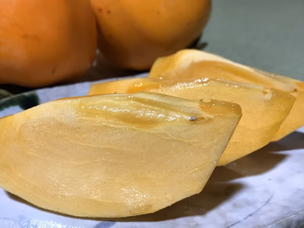 品種は「蜂屋柿」で、柿の中でも大きい粒と糖度が特徴といわれています。もともと渋柿ですが、収穫後アルコール処理をすることで、渋が抜け、甘い柿に仕上がります。