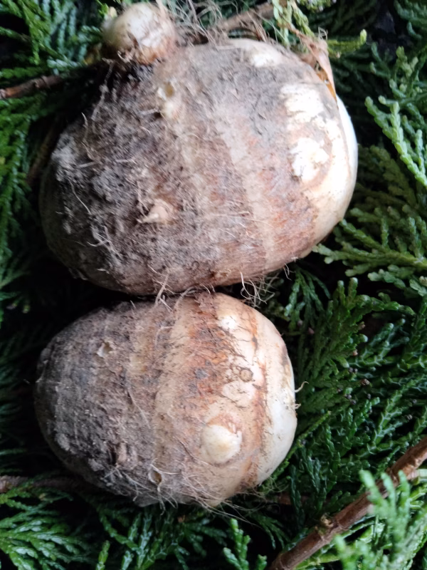 栽培期間中は農薬や化学肥料を使っておらず、豊かな自然の中でじっくり育った作物をお届け致します。 (写真はイメージです) 毎秋に里芋の株をいくつか残し、土や籾殻をたくさんかけて寒さから守り、越冬させます。この里芋たちは翌年の種芋になります。 今年も遅霜の心配がなくなった4月末に種芋を掘り起こしました。氷点下10℃近くまで気温が下がる日もあったにも関わらず、全ての芋たちは無事でした。 種芋はゆっくりと芽を出し、時には草に埋もれそうになりながらもどんどん成長し、最後は大人の背高ほどの高さになりました。 寒い日にぜひ、里芋を煮込み料理やお味噌汁の具としてお召し上がり下さい。 今回お送り致します里芋は30〜50g程度のやや小さい〜中サイズです。 今回はご希望の量の里芋を厳選し、概ね1週間以内に常温でお送り致します。 里芋に付いている土は、芋を傷が付かない程度、落としますが、多少の土の汚れはご了承下さい。また、小さな傷もご了承下さい。 おまけは、銀杏、ヤーコン、春菊、小松菜、さつまいもなどの旬の野菜から選択し、お送り致します。お選びいただくことはできません。ご了承下さい。 (ご不要な方はご連絡下さい) ご注文をお待ちしております。