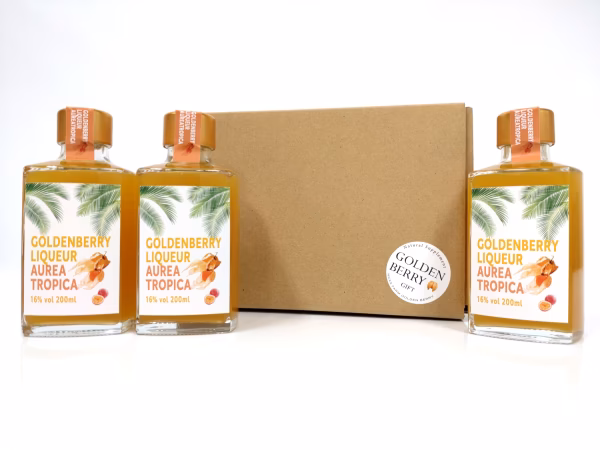 新商品のゴールデンベリーリキュール アウレアトロピカを贈り物に最適なギフトボックスに梱包してお届けいたします。