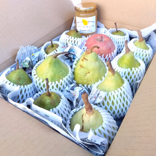 洋梨(ル・レクチェ加工用&生食用、ウィンターネリス加工用・生食可)、ふじ小玉が入ります。ラフランスジャム1個も入ります