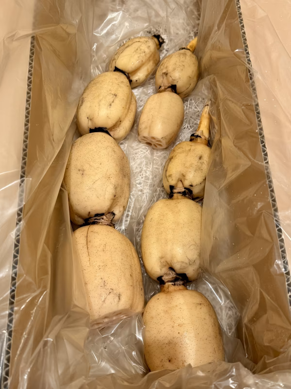 蓮根の部分ごとに食感が変わり、頭の方から柔らかく酢の物やサラダに真ん中は煮物や揚げ物に下の方は水分が少なくでんぷんが多く粘りがあるので、ハンバーグやつみれなどにしていただけると更なる食感が楽しんでいただけます。