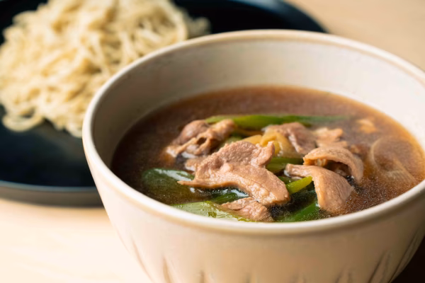 かすみ鴨の旨味たっぷり溶け込んだつけ汁と常陸秋そばのセットです。
