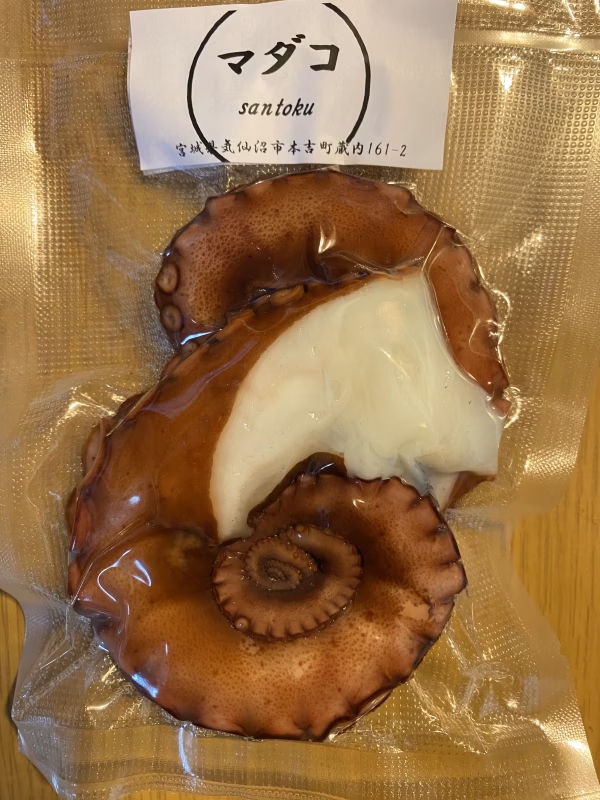 気仙沼の海で育った旨みたっぷりのマダコを茹で上げ 1袋 約140g 〜150g詰めました。タコの足が一本から二本入っています。
