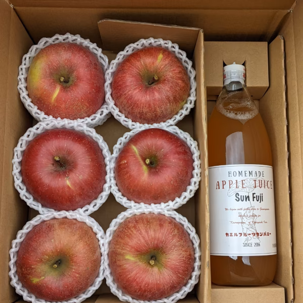 当園自慢の葉とらずサンふじ約2.5キロ(大〜中玉5〜6個)と、葉とらずサンフジをぎゅっと絞った100%ストレートジュースをセットにしました。