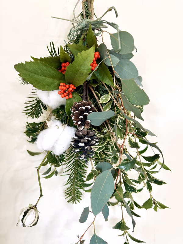【クリスマス用スワッグ】飾るだけでお部屋が一気に“クリスマス仕様”に。綿花のふんわり感と、松ぼっくり・赤い実のアクセントが温かみのある冬を演出します。届いたら吊るすだけ。 今年のクリスマスは、ナチュラル素材の上質スワッグで華やかに。自然素材だけで束ねた、あたたかみのあるクリスマススワッグ。 赤い実・ユーカリ・綿花・松ぼっくりを組み合わせ、冬のやさしい雰囲気をそのまま切り取ったような一品です。 玄関やリビングに飾るだけで、クリスマスの訪れを感じられます。スワッグにしてお届けします。届いたら、風通しの良いところに吊るしてください。 =========================================== お花を飾ることで、いつもの生活が彩りあふれる暮らしとなりますよう願いを込めて、お届けいたしております。(配送において、暑さの影響もあることから、万が一のために多めに入れています。) また、花ランドではできるだけ農薬を使わずに生産しています。出荷前に確認しながら梱包作業をしておりますが、一部、虫食いの葉っぱなどあるかと思います。ご理解いただきますようにお願いします。 #自己紹介 はじめまして、花ランドの浜田です。 香川県の田舎で妻とお花の多品種生産農家をしています。ご自宅用はもちろん、大切な人へ贈りものやあなたの気持ちを伝えるお手伝いをさせていただきます! #こだわり ①花ランドでは多品種の生産をし、ほとんど農薬を使わない自然農法にこだわり、季節に応じて旬の花をメインにお届けします。 ②生産者から直接に販売のため花市場より利用者に安くお届けできます。 ③生産者の顔がみえる販売方法のため、安心していただけます。 ④妻は花屋の娘だったこともあり、依頼先へのプレゼント用のラッピングも可能です。お花だけの配送もできるだけ新鮮を保つ方法でなおかつ丁寧な梱包に心がけています。プレゼント用は簡易的にリボンをおつけして配送します。 ※北海道、沖縄、離島などへの配送日数がかかるために取り扱いしておりません。申し訳ありません。