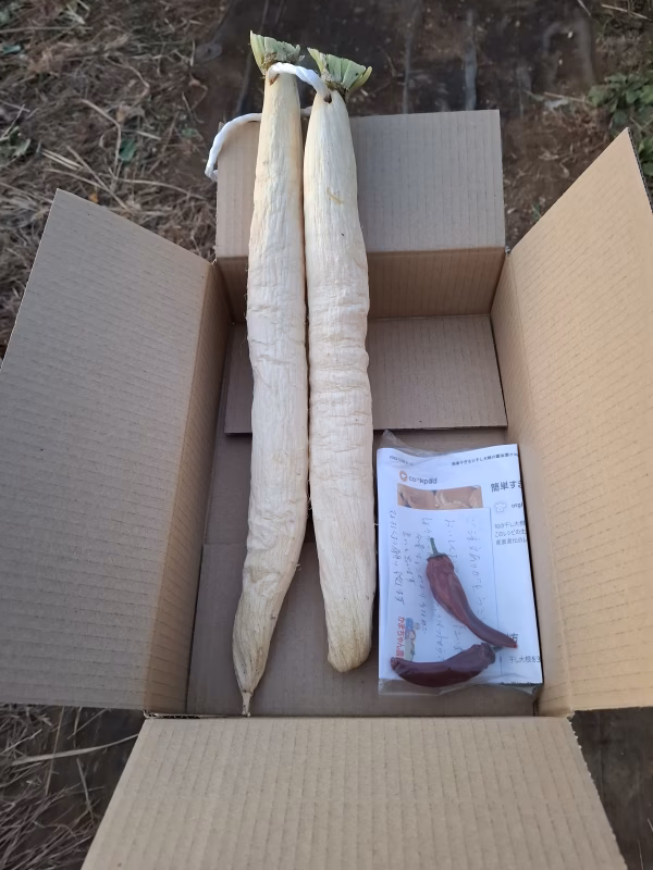 ▼自己紹介 地元の大型農産物直売所に「かまちゃん農園ブランド」で、ほぼ毎日出荷しています。 ▼商品概要 たくわん用干し大根ならではのパリパリ食感がたまらない!! たくあん用干し大根を、醤油、・酢、・ざらめ・昆布・唐辛子の漬けダレに漬け込むだけ!! ★レシピ&唐辛子付き★ ★写真は出来上がりのイメージです。 ▼品種・味の特徴・食べ方 たくあん用干し大根にしかないパリパリ感があじわえます。 塩味・酸味・甘みがあとを引きます。 お茶うけ&お酒のおつまみに最高!! チーズを挟んで食べるのもグッドです。 ▼数量、分量の目安 たくあん用干し大根:2&4本 ★よく干してあるので少し細めです。 ▼栽培/生産方法、こだわり 大根はお陽さまの光をいっぱい浴びた露地栽培です。 雨除けテントの下で7日から10日間天日干ししています。 ▼注文に際しての注意点(配送方法や納期指定など) ★増量希望の場合は事前にご相談ください。 ★生鮮食品ですので、スムーズなお受け取りをお願いします。 ★干しあがり次第の発送となりますので日時指定は受付けできません。