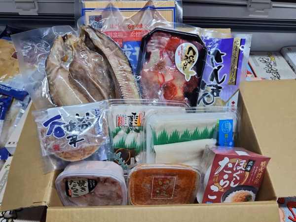 刺身用イカ、タコ、マスイクラ、ホッケ干物、イカ塩辛、やきタラコ、ほぐしたらこ、クジラベーコン、イカ一夜干し、さんま