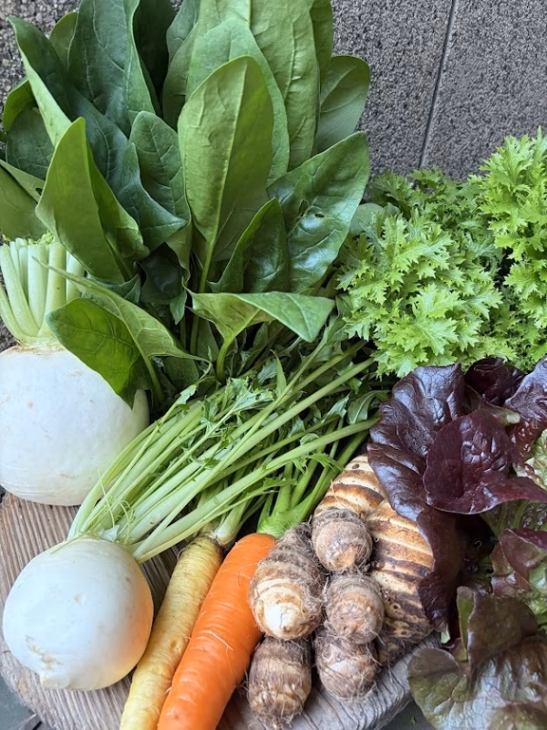 ・葉っぱも美味しいまるごと蕪、ほうれん草、サラダ春菊、リーフレタス、わさび菜、人参(生でおいしい)