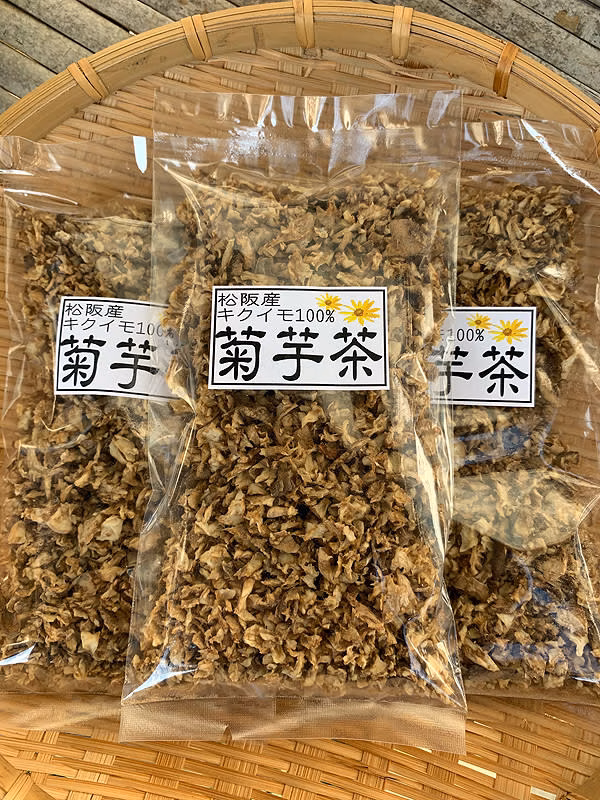 - [名称] 菊芋茶(乾燥菊芋) [原材料名] 菊芋(松阪市飯南町産) [内 容 量] 70g [賞味期限] 1年間(※袋の裏ラベルに記載) [保存方法] 高温、多湿、直射日光を避け保存