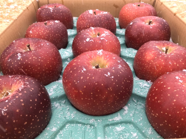 果点が雪の様に見えることから名づけられた、青森県生まれの品種。果肉がうっすら赤みがかって、とても甘い品種です。最大の特徴は、果肉が変色しにくい事。当園では、子供のお弁当にと栽培を始めました。
