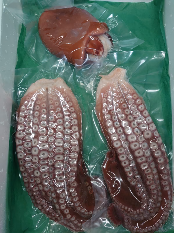 タコ箱漁で水揚げされたタコを即浜茹でし、真空パックをして急速冷凍しています。