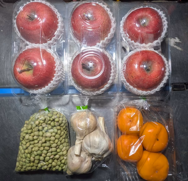 青豆500g、ニンニク300g、柿500g、リンゴ2.4kgの詰め合わせです。 青豆とニンニクは、不揃いのB級品です。 柿は低温で熟したものですので、柔らかくなったものとそうでないものがあります。リンゴはふじの大玉サイズです。 年末年始にご利用ください。