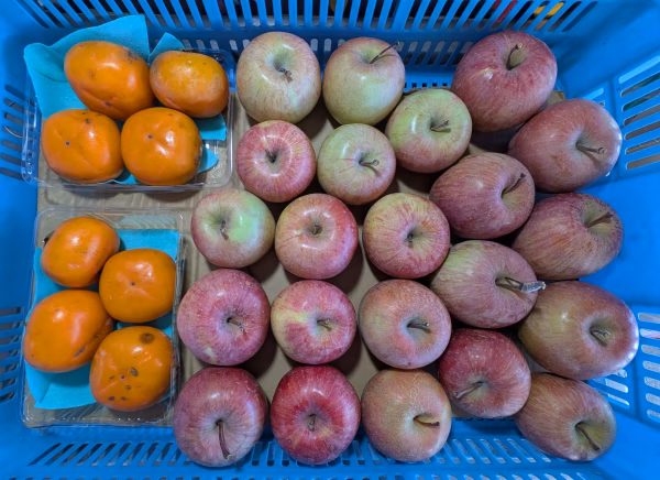 柿は柔らかくなっており、キズ等があります。リンゴは小さいサイズの着色不良等で、キズ、割れ等があります。