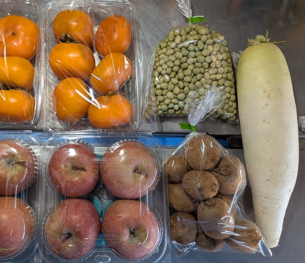青大豆500g、ダイコン700g、キウイ500g、柿1.5kg、リンゴ1.6kgの詰め合わせです。柿の品種は平核無しで柔らかくなったものとそうでないものがあり、大きさにより1パックの個数が異なります。低温で熟したものです。キウイはサイズが小さい規格外品です。リンゴは着色不良の小サイズです。青大豆とダイコンはB級品です。