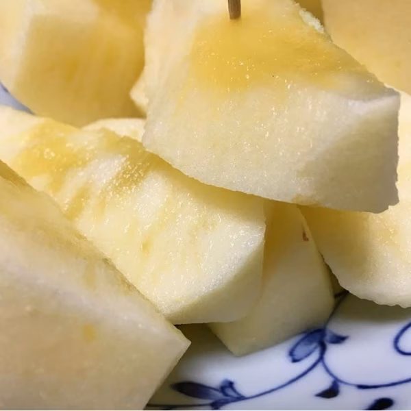 あまり葉をとらず栽培、またいわゆる着色系ではない普通ふじです。葉をとらないと着色は劣りますがその分光合成しているので糖度は増しています。