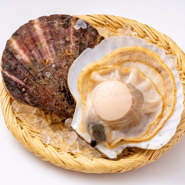 越喜来湾の波に育てられた肉厚なホタテを殻付きの活でお届けします。