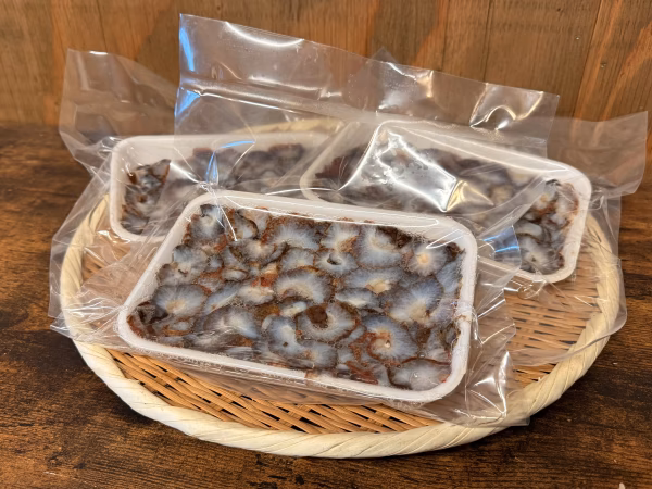 到着後はすぐ食べられる場合は解凍し塩水ですすぎお食べ下さい。まだ食べられない場合は冷凍保存して下さい。