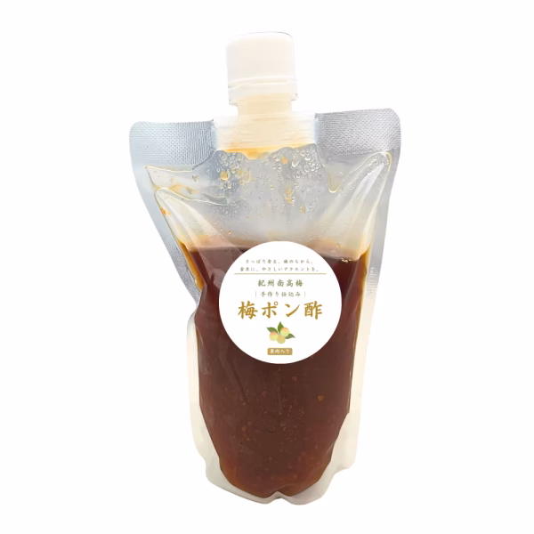 和歌山県産(自家農園)紀州南高梅の果肉入り。やさしい酸味で毎日使える、紀州仕立ての梅ポン酢です。