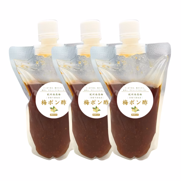 ▼商品概要 和歌山県産(自家農園)紀州南高梅の果肉入り。やさしい酸味で毎日使える、紀州仕立ての梅ポン酢です。 ▼品種・味の特徴 自家農園で育てた紀州南高梅を使用し、果肉感を残すことで、さっぱりしながらも梅のまろやかな風味が料理全体を引き立てます。 ▼数量、分量の目安 1本300ml × 3本 ▼栽培/生産方法、こだわり 生産から加工、販売を全て自家農園で行っています。梅の果肉を入れることで梅の香りと味わいをより感じていただけます。 ▼注文に際しての注意点(配送方法や納期指定など) 時期により商品の発送が遅くなる場合がございます。