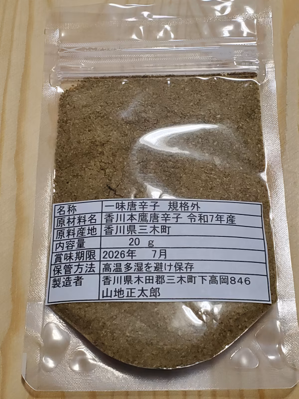 香川本鷹唐辛子 一味 20g 規格外 お待たせしました。 香川本鷹唐辛子ですが昨年の猛暑により生育障害がおきてしまい収穫がほとんどありませんでした。 熟すまでとねばっていましたが赤くなる前に木がもたず今年は規格外のみの販売になります。 申し訳ございません。 数に限りがあります。 農薬、肥料(化学・有機含む)除草剤は使用してません。 農薬、除草剤は33年間使用せずH27年より無肥料で栽培してます。(H27年までは有機植物性肥料使用) の畑で育った自家採取7年目の香川本鷹を乾燥して一味にしました。 ミキサーの性能上で種や大きな破片がある場合があります。 ご理解の上で宜しくお願い致します。 数量限りがありますが興味あるかたは宜しくお願い致します。 香川本鷹唐辛子は香川の特産品になります。 旨味がつよい辛さが、特長になります。 希望数量や他の商品と一緒に購入希望があればメッセージにてお問い合わせ下さい。 まとめたほうが送料がお安くなる場合があります。