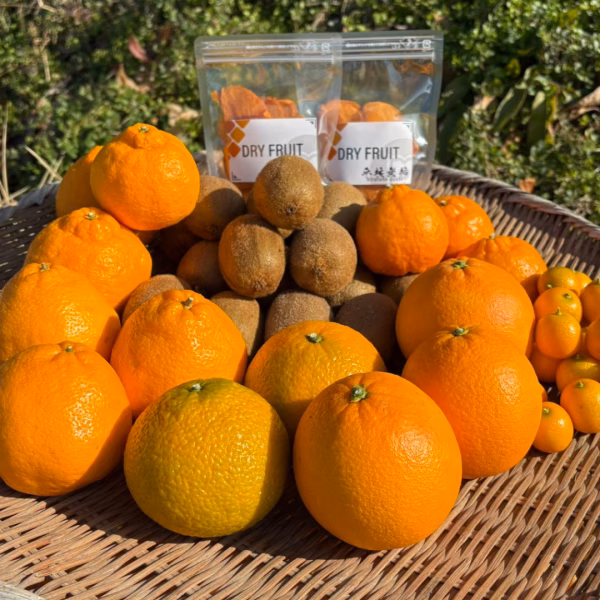 晩柑系の柑橘とキウイフルーツ、11月に収穫して寝かせておいたドライフルーツを1つにまとめてお送りいたします。