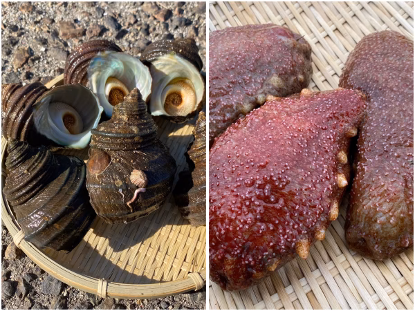 江田島の海で素潜り(約7mの水深)にて丁寧に採取した新鮮なサザエとナマコです。